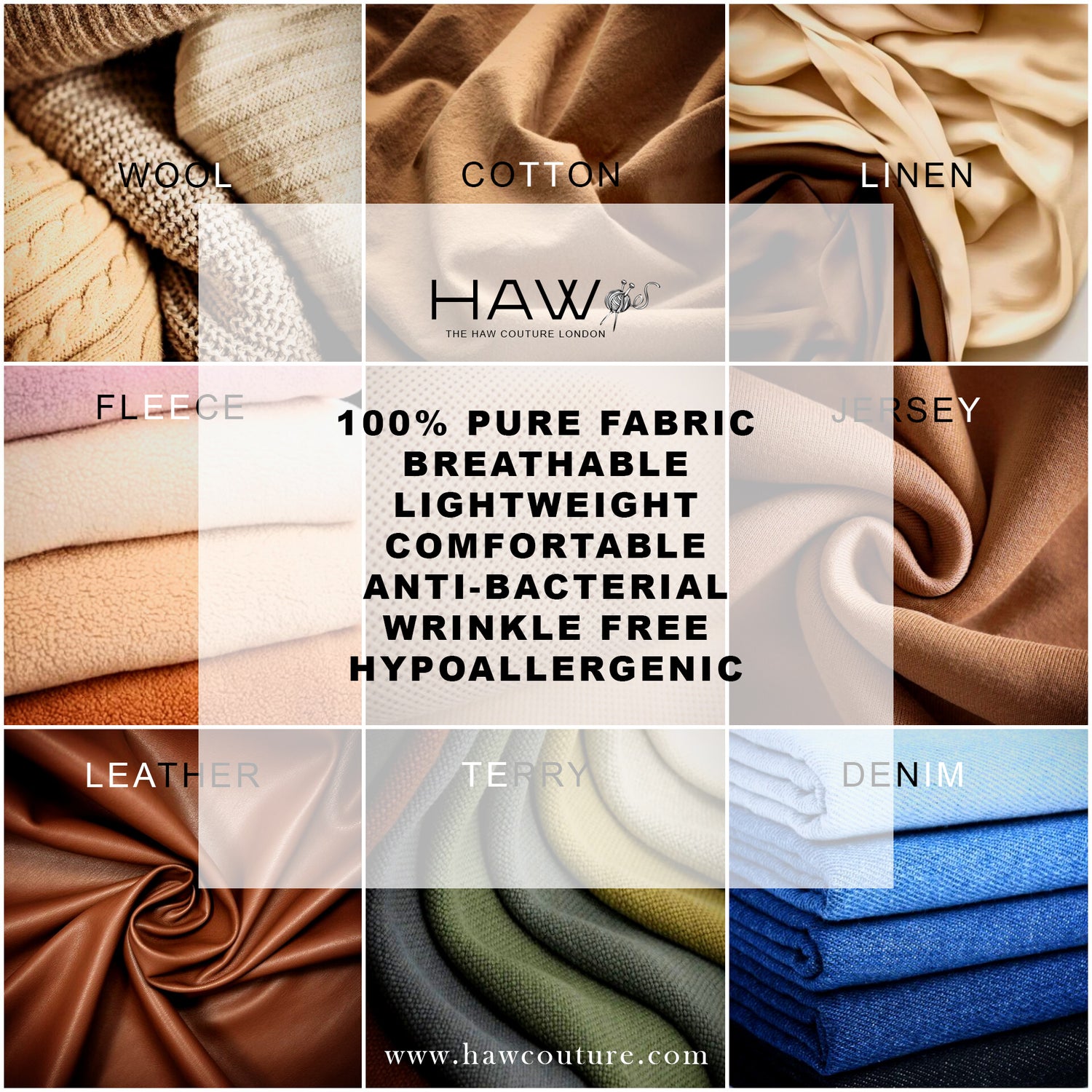 We use customised fabrics with premium quality and luxurious feel which includes TERRY, WOOL and JERSEY stuff for the manufacturing.